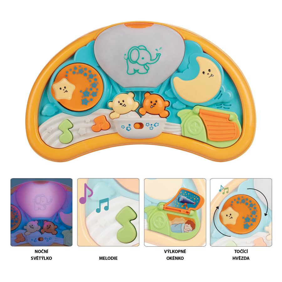 Roztomilá interaktívna hračka, ktorá zabaví dieťa na dlhé hodiny. Doska v tvare mesiaca z kvalitného plastu disponuje tlačidlami s medvedíkmi, hviezdičkami a mesiacom. Tlačidlá pri stlačení hrajú melódie, elementy na doske sa dajú otáčať a rôzne otvárať. Hračka rozvíja fantáziu a psychomotorické zručnosti. V noci hračka slúži ako tlmené nočné svetielko, ktoré dieťaťu pomôže prekonať strach z tmy.