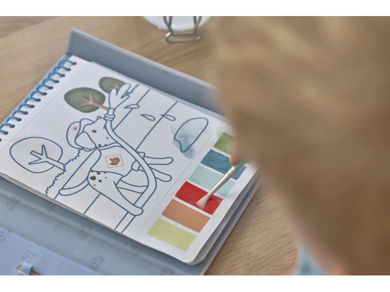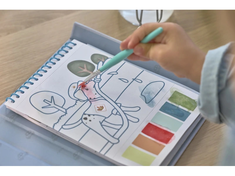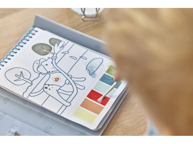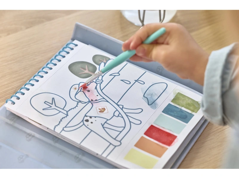 Vďaka pevnému obalu s magnetickým zapínaním a pútkom na štetec je všetko úhľadne pohromade. Špirála v chrbte umožňuje ľahké otáčanie stránok omaľovánok.
