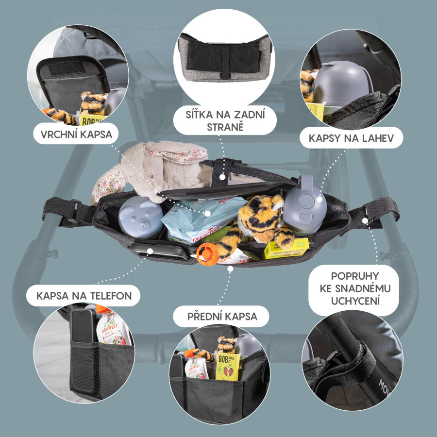 Organizér na kočík PLUS je svojou perfektnou veľkosťou vhodný ku každému kočíku. Je veľmi priestranný a obsahuje až 6 vreciek, ktoré vyhovejú potrebám a požiadavkám každej modernej mamičky. Samozrejmosťou je predné vrecko na mobil a vrecko na drobnosti. V zadnej časti organizéra sa nachádza väčšie sieťovinové vrecko na umiestnenie časopisov. Hlavné vrecko je riešená tak, aby sa po bokoch dali umiestniť fľaše. Jeho inštalácia je jednoduchá a rýchla za pomoci háčikov na suché zipsy.