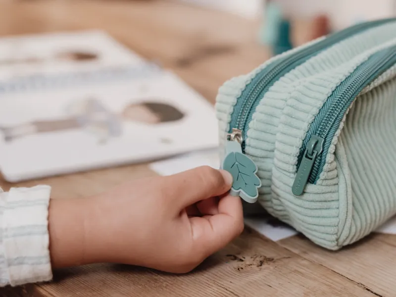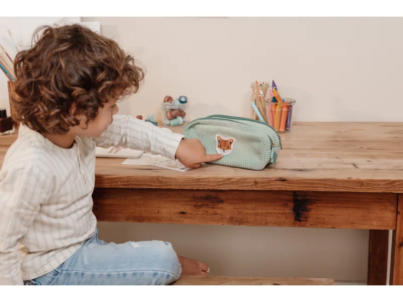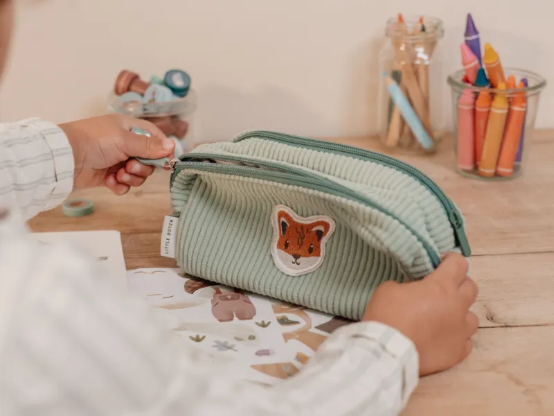 Puzdro na písacie a výtvarné potreby v krásnom prevedení s aplikáciou líšky má dve časti uzatvárateľné na zips na prehľadné uloženie výtvarných potrieb vášho malého umelca.