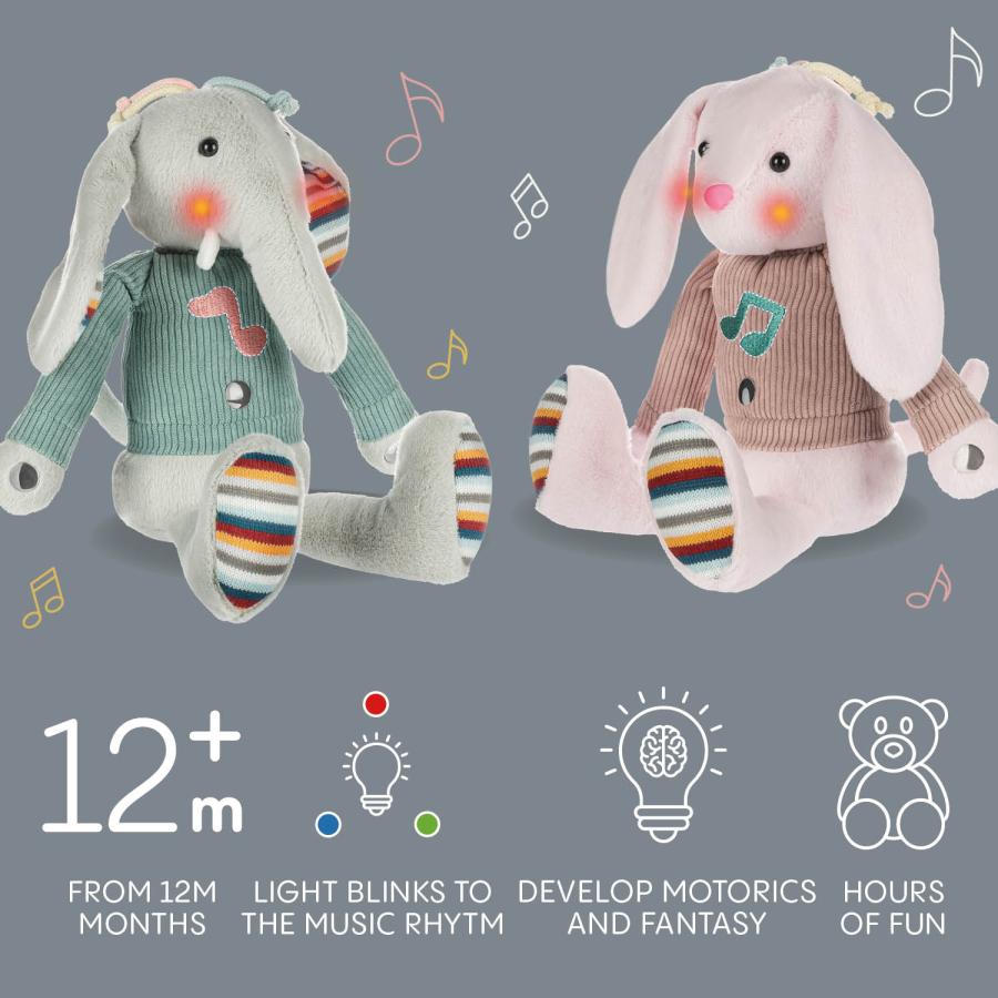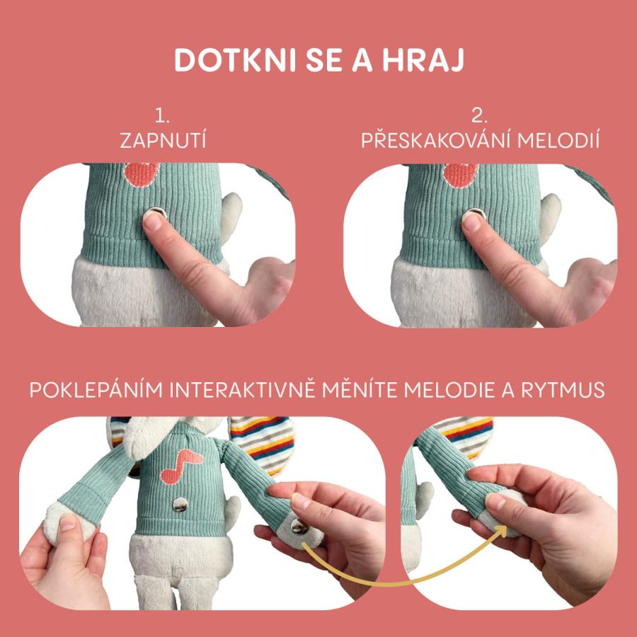 Interaktívny plyšový kamarát pre deti od 12 mesiacov reaguje na dotyk, hrá veselé melódie a vytvára pútavé svetelné efekty. Stačí jemné poklepanie na bruško a spustí sa jedna z melódií, ktorá deti motivuje k objavovaniu a pohybu. Hebký materiál z neho robí obľúbeného spoločníka na hranie, maznanie aj zaspávanie.
