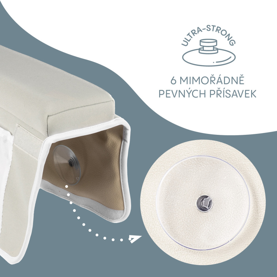 Podložka je vybavená šiestimi silnými prísavkami, ktoré zaisťujú, že zostane bezpečne na mieste. Bočné panely sa ľahko prispôsobia aj vaniam s koľajnicami sprchových dverí. Štyri praktické vrecká navyše poskytujú priestor na uloženie mydiel, šampónov či ďalších kúpeľňových doplnkov, aby ste mali všetko potrebné vždy poruke.
