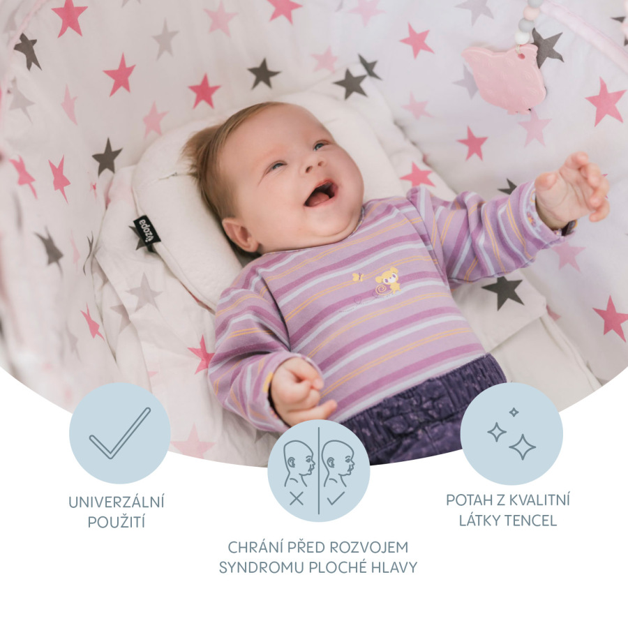 Vďaka vysokej priedušnosti zabraňuje nadmernému poteniu. Vankúš možno použiť v postieľke, kočíku aj autosedačke.