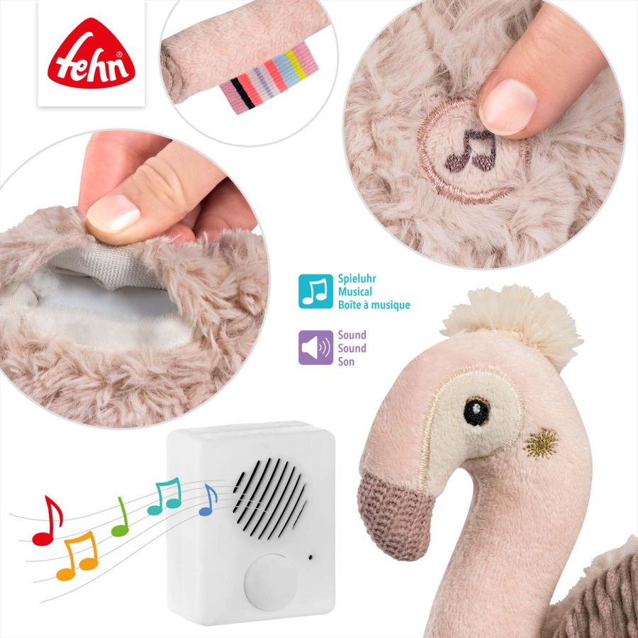 IDEÁLNY POMOCNÍK PRI ZASPÁVANÍ – S 10 príjemnými zvukmi a hebkými materiálmi si plyšový plameniak získa srdce každého bábätka – ideálny ako prvý kamarát do postieľky.