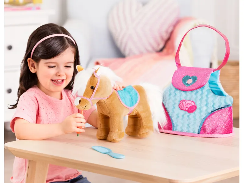 Plyšový poník v taške je rozkošný spoločník pre deti od 3 rokov, ktorý je vždy pripravený na objatia aj spoločné dobrodružstvá. Vďaka praktickej taške s postrannými otvormi si ho dieťa môže vziať na prechádzku, výlet či návštevu a poník pritom „vidí“ na svet okolo seba. Starostlivosť o hebkú hrivu a doplnky v balení podporujú fantáziu a tvorivú hru.