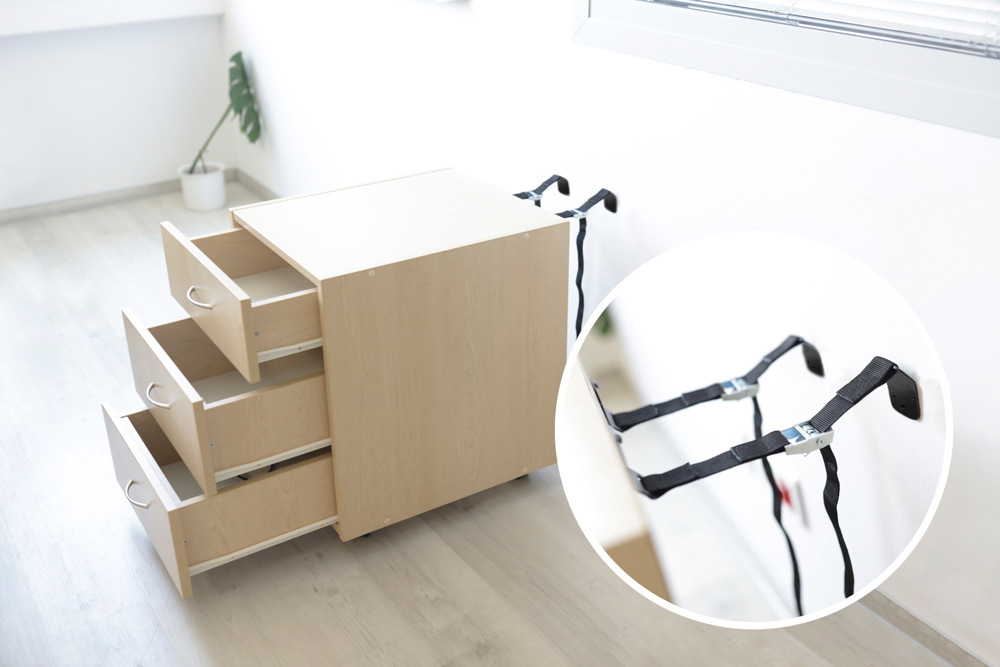 Pevné pásy zabraňujú prevrhnutiu nábytku v prípade, že naň dieťa vlezie. Možno ich pripevniť na šatníkové skrine, knižnice, komody, skrinky a ďalší veľký nábytok. Pevné kovové komponenty zaisťujú, že konštrukcia bude stabilná.