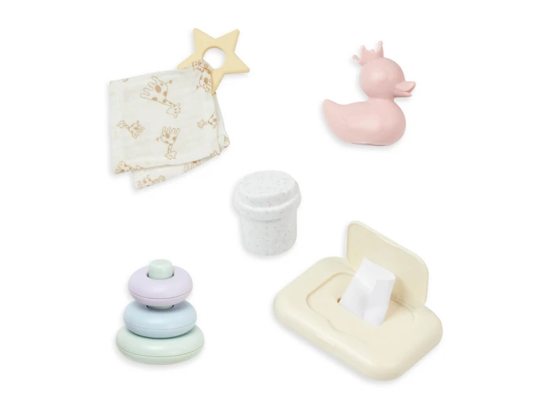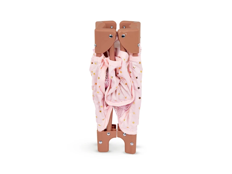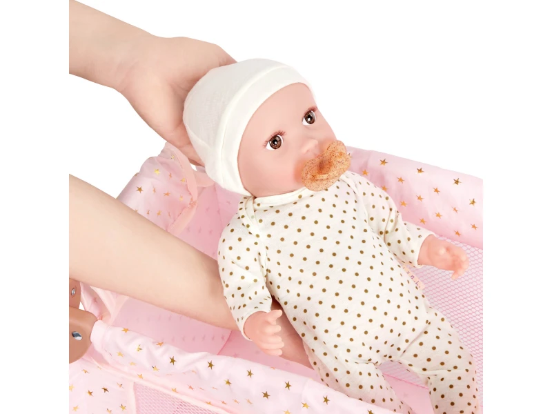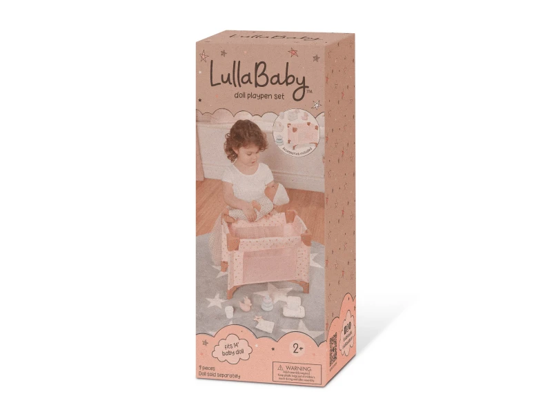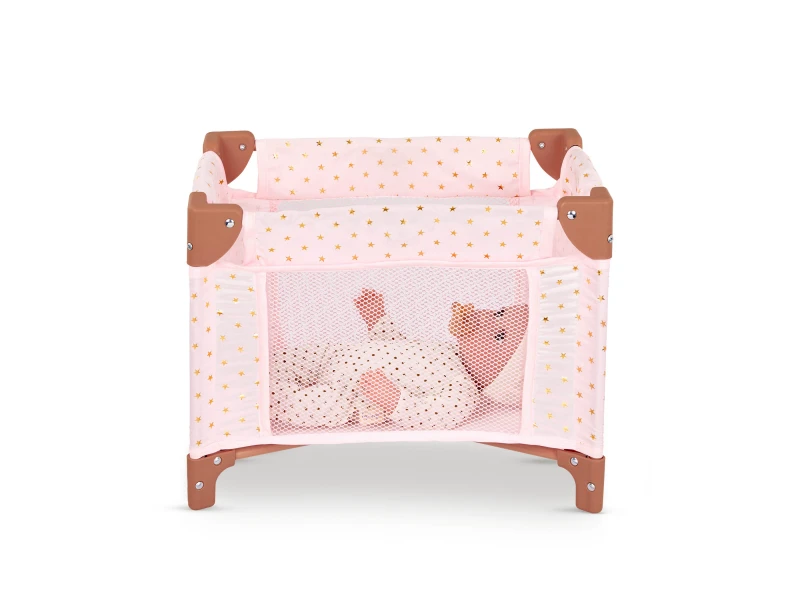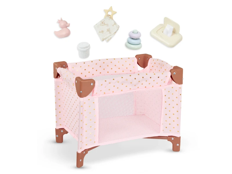 Doprajte bábike vášho dieťaťa krásne miesto na snívanie aj hranie s touto štýlovou postieľkou LullaBaby. Jemné ružové prevedenie so zlatými hviezdičkami zapadne do každej detskej izbičky. Postieľka je stabilná a odolná pre každodennú hru, zároveň sa ale ľahko zloží naplocho pre praktické uloženie alebo cestovanie. Súčasťou balenia je sada doplnkov – kačička do kúpeľa, krabička s obrúskami, hryzátko, hrnček a stohovacia hračka.