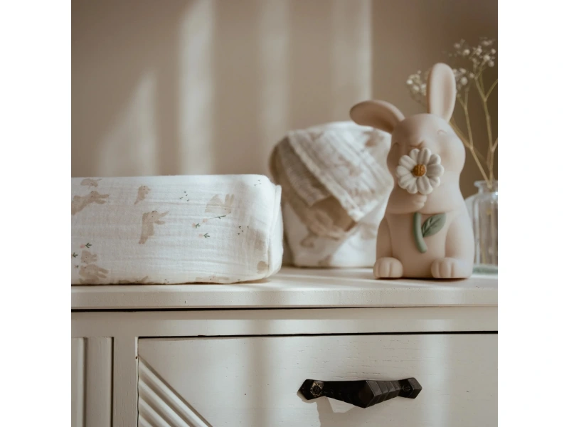 Potah na přebalovací podložku z jemné organické bavlny zpříjemní každé přebalování vašeho miminka. Díky svému roztomilému designu s potiskem králíčků promění přebalovací koutek v krásné, útulné místo. Měkký materiál potahu je pro dítě příjemný a zajistí, že ho přebalovací podložka nebude studit při doteku s pokožkou.