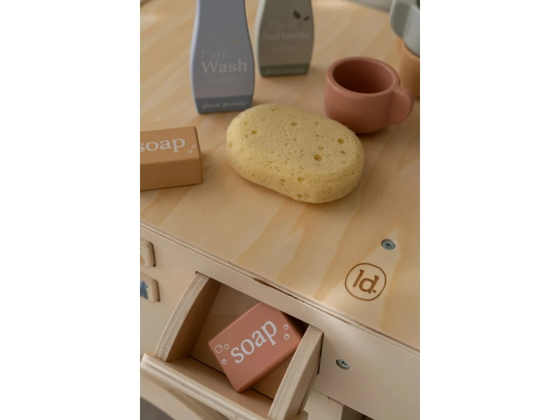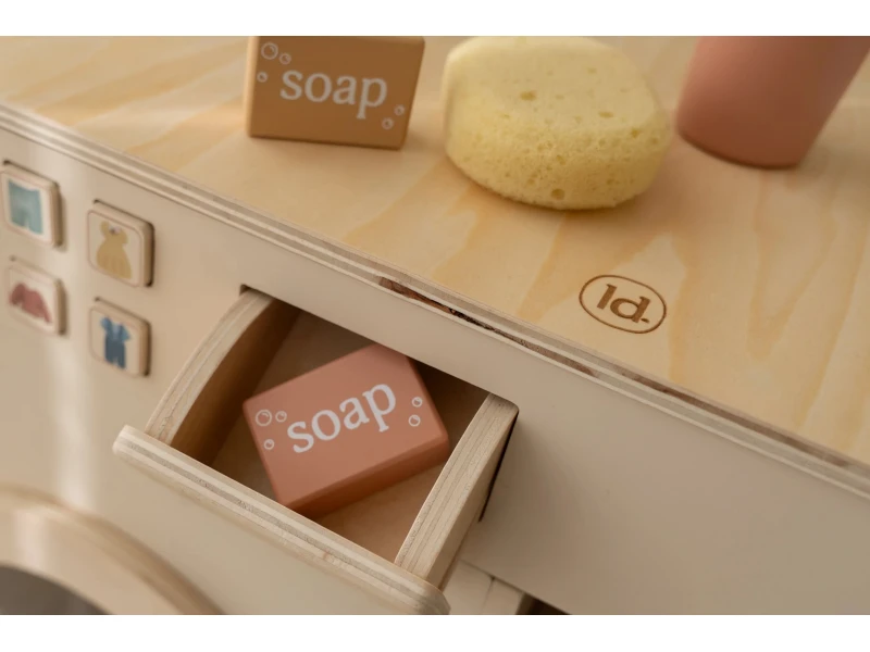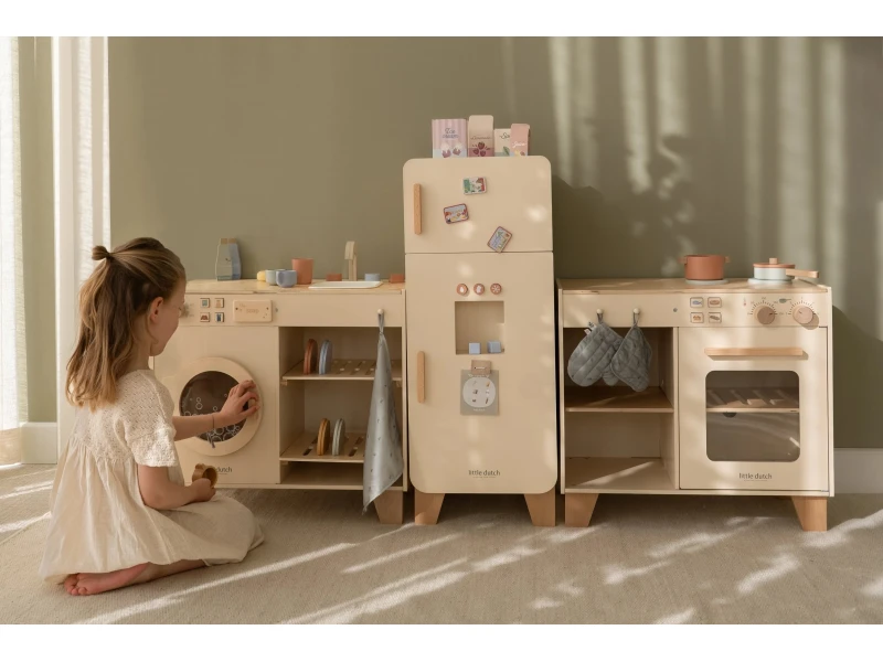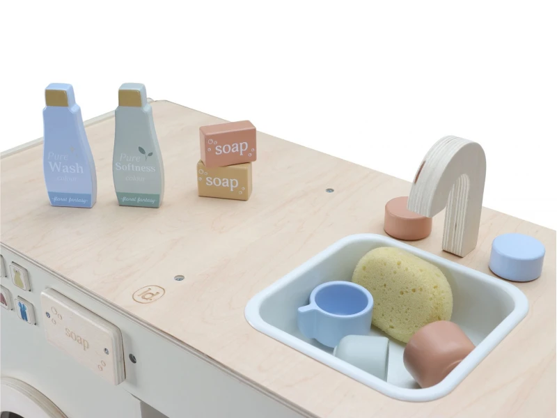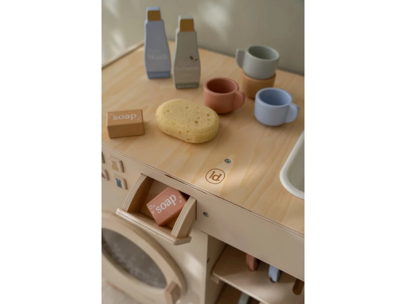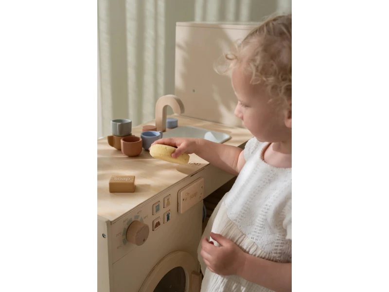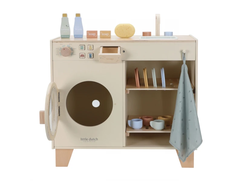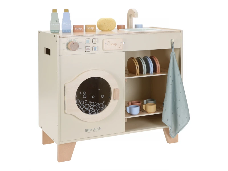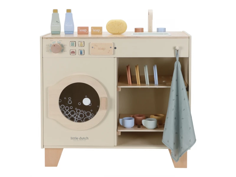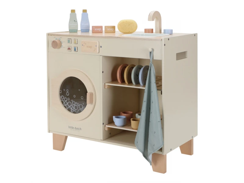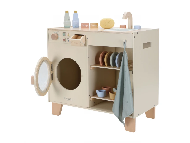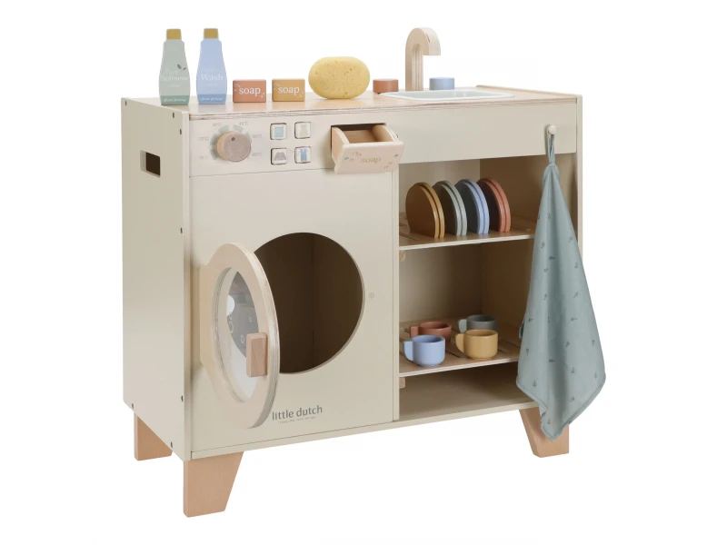 Drevená práčka s drezom Little Dutch prinesie deťom veľa zábavy a naučí ich napodobňovať každodenné domáce práce. Deti môžu bábikám vyprať oblečenie, umyť riad a pritom sa učiť zodpovednosti hravou formou. Vďaka otočným gombíkom, tlačidlám a priehradke na prací prostriedok pôsobí celý set realisticky a podnecuje fantáziu aj tvorivosť.