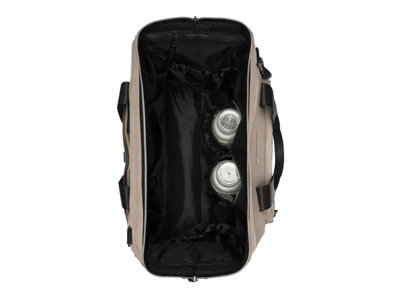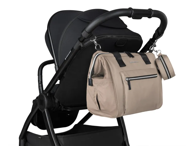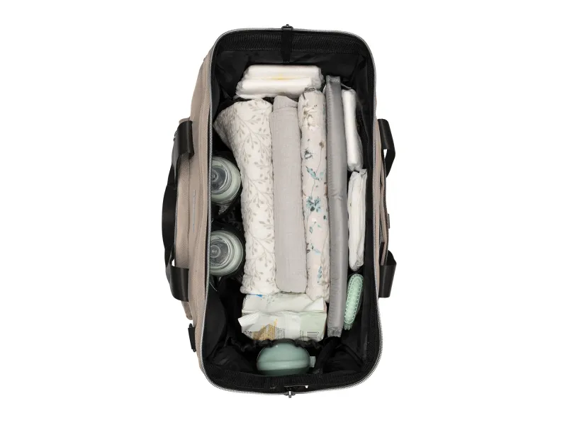 Vnútri tašky nájdete množstvo vreciek a priehradok, vodeodolné vrecko na uloženie vlhkých predmetov a dve termoizolačné vrecká na fľaše. Široký spôsob otvárania tašky uľahčuje orientáciu v uloženom obsahu. Na vonkajšej strane nájdete vrecká s uzatváraním na zips aj vrecko na uloženie fľaše. Súčasťou tašky je aj odnímateľné puzdro na drobnosti a prebaľovacia podložka.