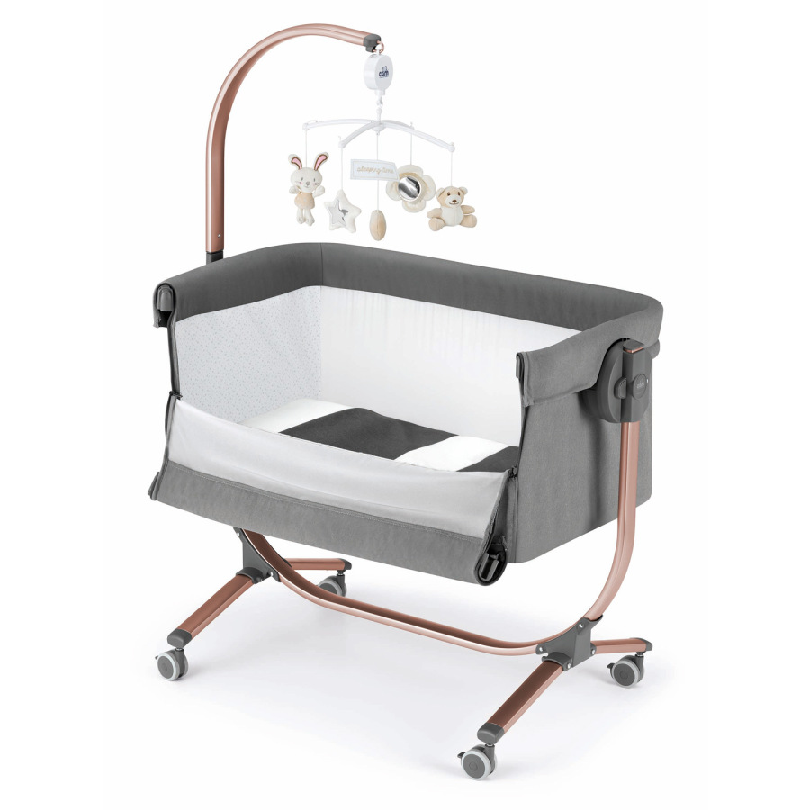 rôznych výšok i polohovať. Je ukotvená v kovovom ráme, postieľku lze zaistiť