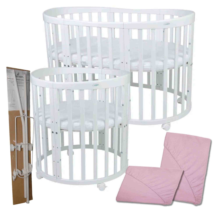 Rastúca postieľka set 7v1 - Biela (matrac, 2x plachta + držiak baldachýnu)