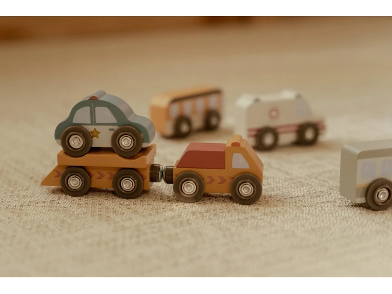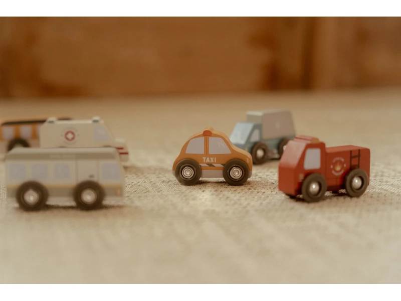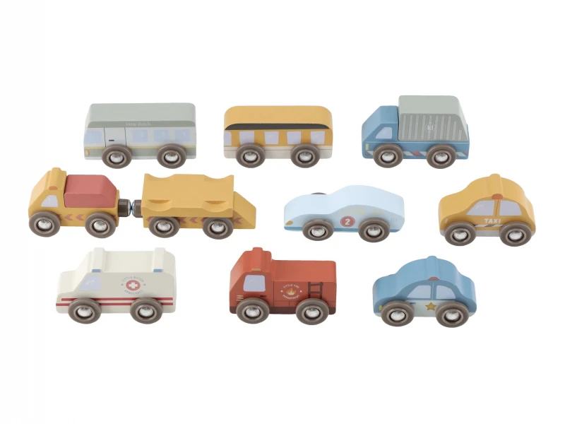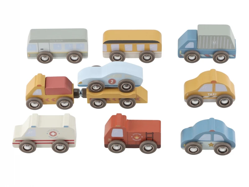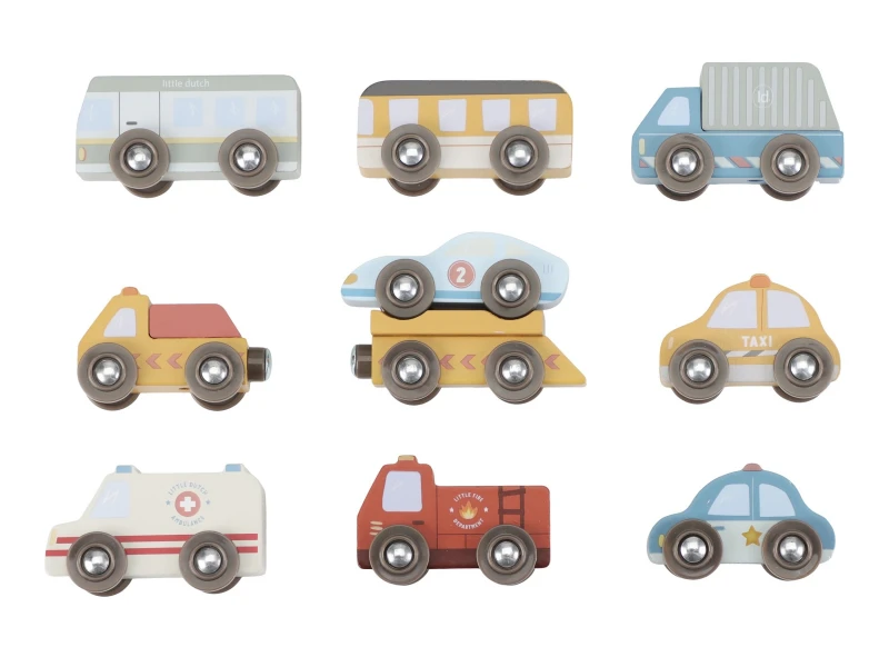 Mesto je vždy plné pohybu a nových príbehov! Sada drevených autíčok Little Dutch prináša deťom rôzne vozidlá, ktoré reprezentujú známe profesie. Hasičské auto vyrazí k požiaru, policajné vozidlo dohliada na bezpečnosť a nákladné auto privezie zásoby. Každý deň si deti môžu zahrať nové dobrodružstvá a rozprávať vlastné príbehy.