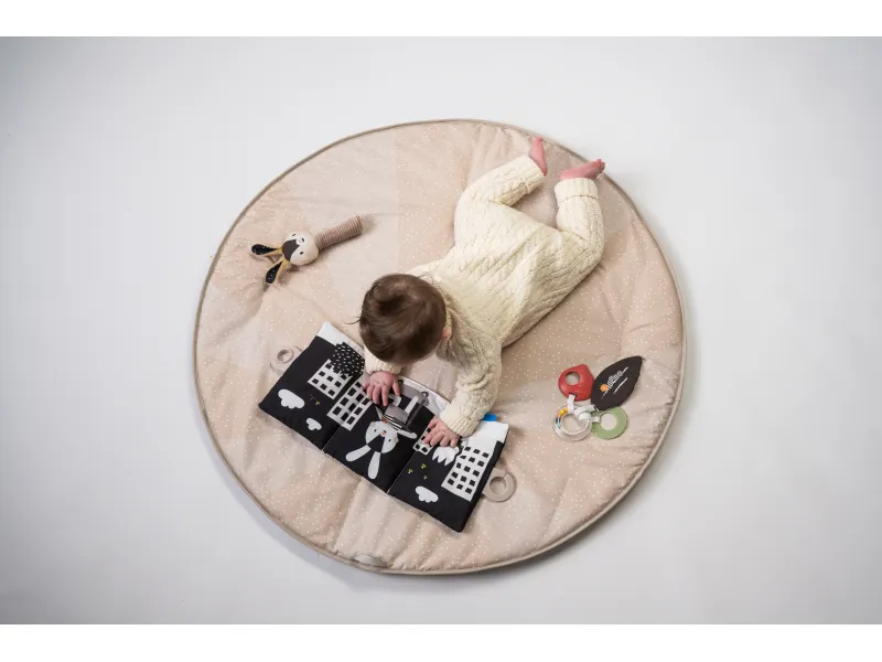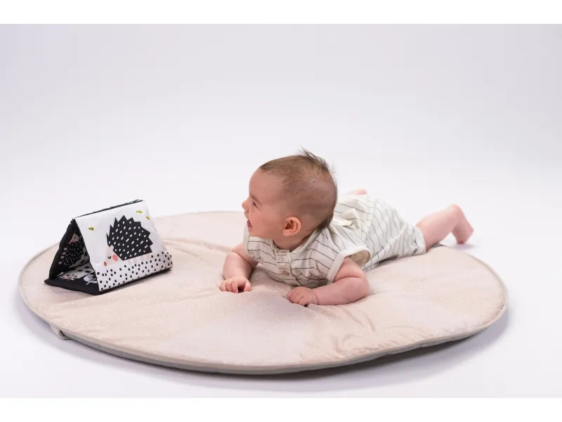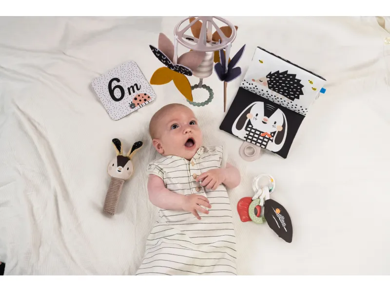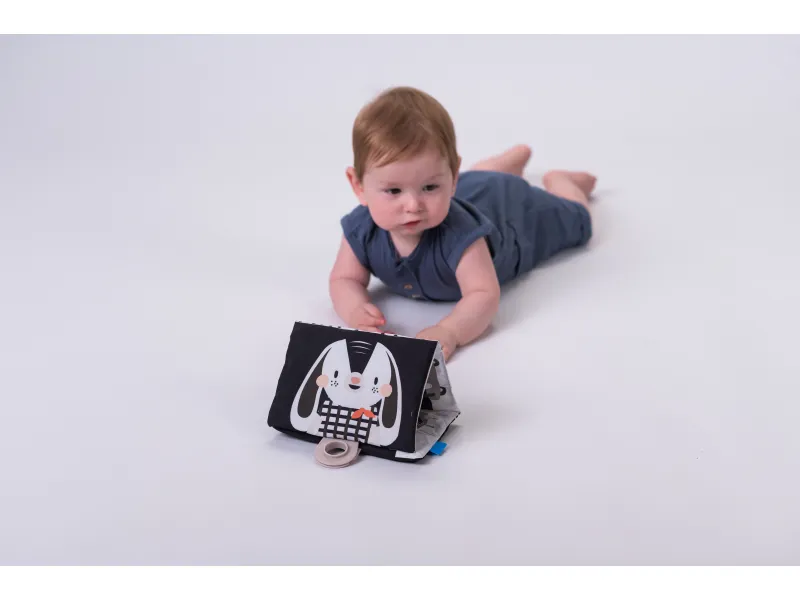- Knižka na bruško: Černobiela šuštivá knižka pre stimuláciu zmyslov je ideálna pre čas hry na brušku, podporuje zrakový a sluchový vývoj.