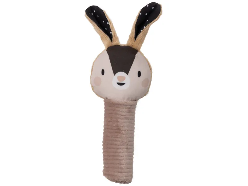 - Pískací zajačik: Pískacia hračka s hlavou zajačika a šuštivými uškami poskytuje ďalšie zmyslové podnety a prispieva k porozumeniu príčine a následku.