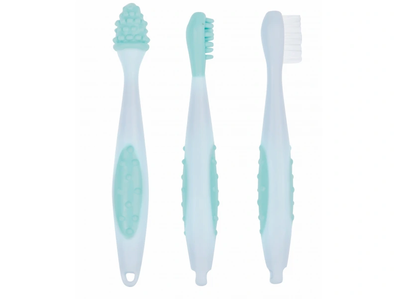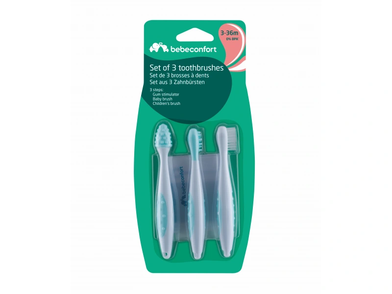 Sada obsahuje masážnu kefku pre ďasná dieťaťa pred prerezaním prvých zúbkov, masážnu kefku pre prvé zúbky a citlivé ďasná a kefku pre batoľatá na klasické čistenie zúbkov. Rukoväť kefiek umožňuje ľahké držanie.