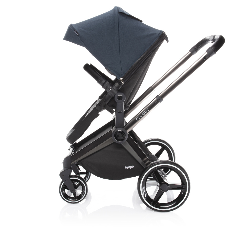 Kočík Zopa Evoque je dizajnový ale zároveň praktický kočík pre deti od narodenia do 15 kilogramov. Ide o dvojkombináciu, kedy sa z rámu priestranné, hlbokej korby vytvorí športové sedenie. Športová sedačka je polohovateľná a možno umiestni po i proti smeru jazdy. Dieťa chráni päťbodový bezpečnostný pás.