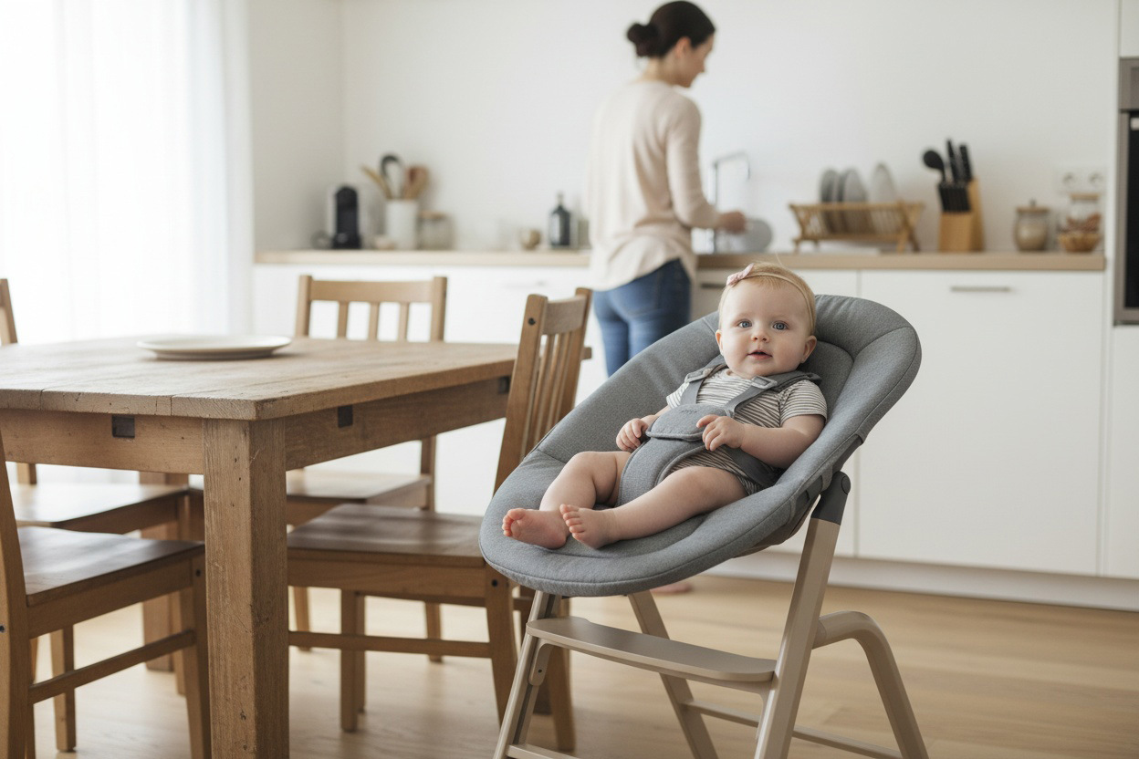 Akonáhle dieťa začne samostatne sedieť, jednoducho odoberiete novorodenecký set a získate vysokú stoličku s praktickým odnímateľným pultíkom. Sedák aj opierku nôh je možné výškovo nastaviť tak, aby sa prispôsobili každej fáze rastu.