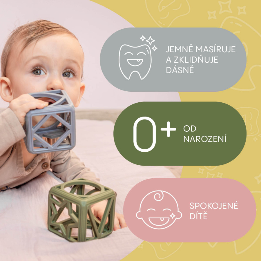 Pomôžte svojmu bábätku prekonať náročné obdobie prerezávania zúbkov so silikónovým hryzátkom Square. Jeho jedinečný geometrický tvar skvele padne do malých ručičiek a ponúka účinnú masáž ďasien, ktorá zmierňuje nepríjemné pocity pri prerezávaní zúbkov.