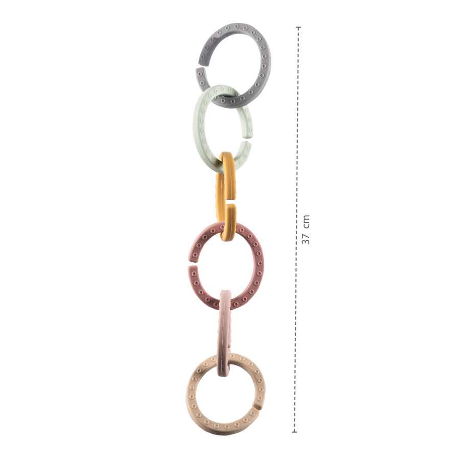 Vrchná časť reťaze je vyrobená z bezpečného potravinárskeho silikónu, ktorý je netoxický a odolný proti rozbitiu. Pre malé deti je silikón prirodzenejší ako plast alebo kov.