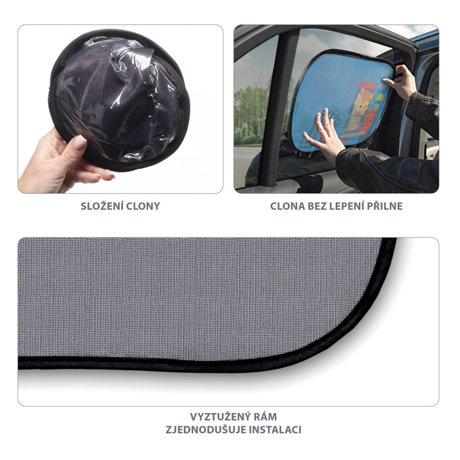 Sieťovaná slnečná clona chráni dieťa v aute pred slnkom. Obsahuje UPF 30+. Jej vystužený rám uľahčuje inštaláciu a premiestňovanie. Skladanie je jednoduché a po zložení je veľmi skladná a šetrí miesto. Balenie obsahuje dva kusy.