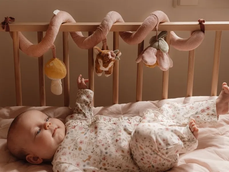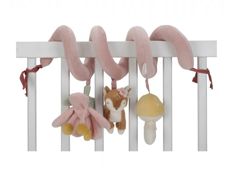 Textilná špirála so zavesenými plyšovými hračkami je ideálnym doplnkom do postieľky, kočíka aj autosedačky už od prvých dní. Nežné motívy srnky, kvetov a hubiek prirodzene lákajú bábätko k dotyku, pozorovaniu a uchopovaniu. Rôzne textúry, hrkajúce a šuštivé prvky podporujú zmyslový rozvoj a koordináciu ruka–oko. Jemný dizajn kolekcie Fairy Garden krásne zapadne do výbavy pre bábätko a odráža citlivý štýl značky Little Dutch.