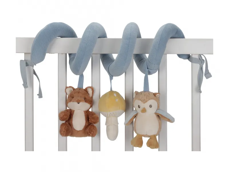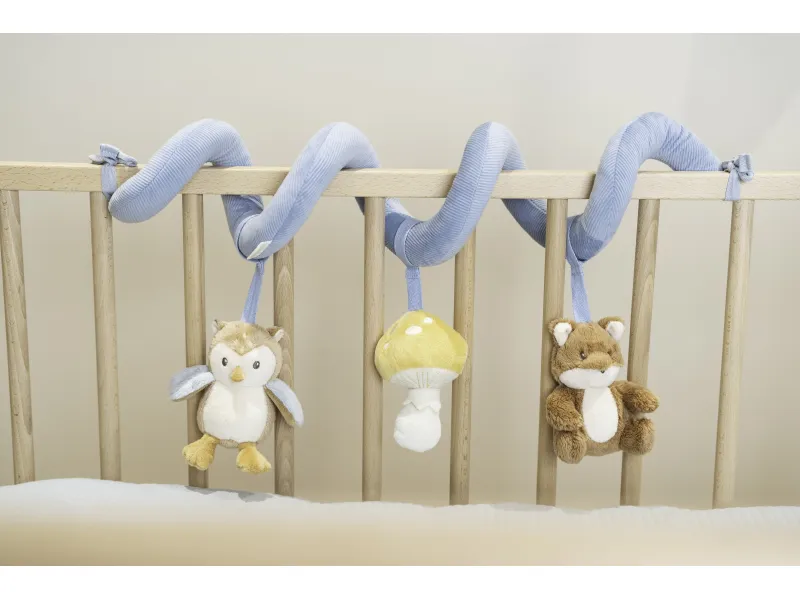 Textilná špirála so zavesenými plyšovými hračkami je ideálnym doplnkom do postieľky, kočíka aj autosedačky pre bábätká od narodenia. Lesné motívy líšky, sovy a hubky prirodzene lákajú dieťa k dotyku, pozorovaniu a uchopovaniu. Rôzne textúry, šuštivé a hrkajúce prvky podporujú zmyslový rozvoj a koordináciu ruka–oko. Jemný dizajn kolekcie Forest Friends krásne zapadne do výbavy pre bábätko a nesie typický štýl značky Little Dutch.