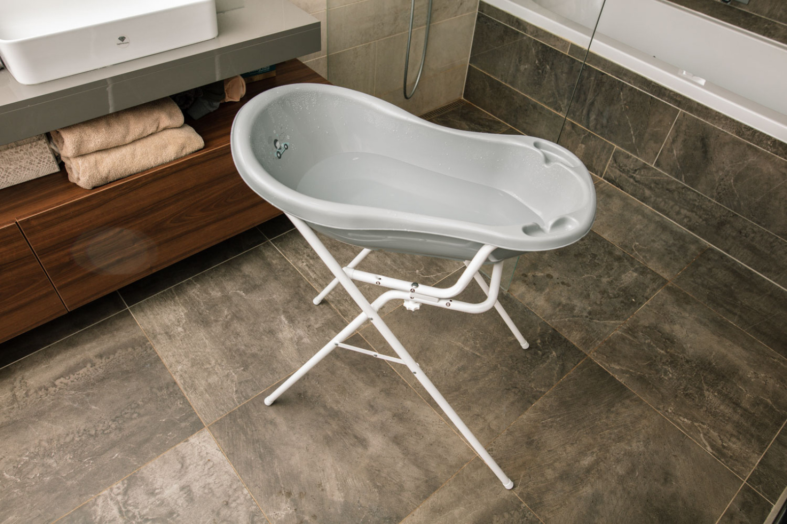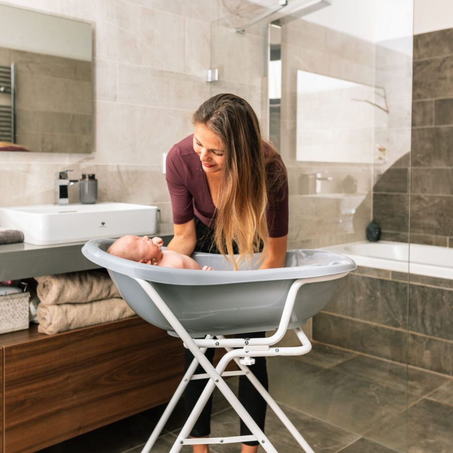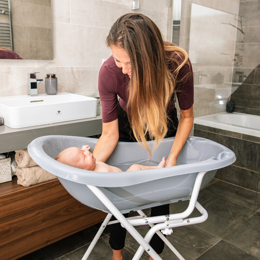 Vďaka nemu môžete vaňu zdvihnúť až do úrovne pása a kúpanie vášho dieťaťa bude oveľa pohodlnejšie. Používajte iba na pevnom, nekĺzavom povrchu - napríklad na podlahe. Stojan nie je určený pre vaňu. Pre čo najväčšiu bezpečnosť dieťaťa by hĺbka vody vo vani nemala presiahnuť 10 cm. Na údržbu môžete použiť handričku s mydlovou vodou.