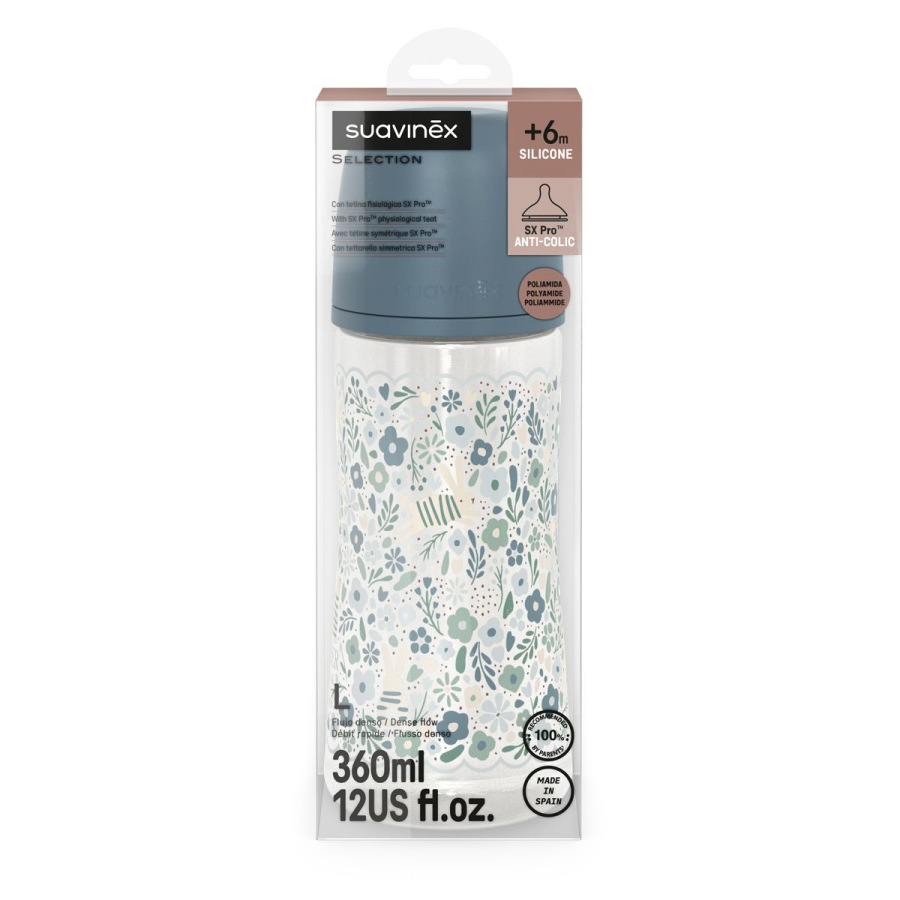 SUAVINEX | Dojčenská fľaša WONDERLAND NEW 360ml FYZIOL PRŮTOK L - modrý kvet