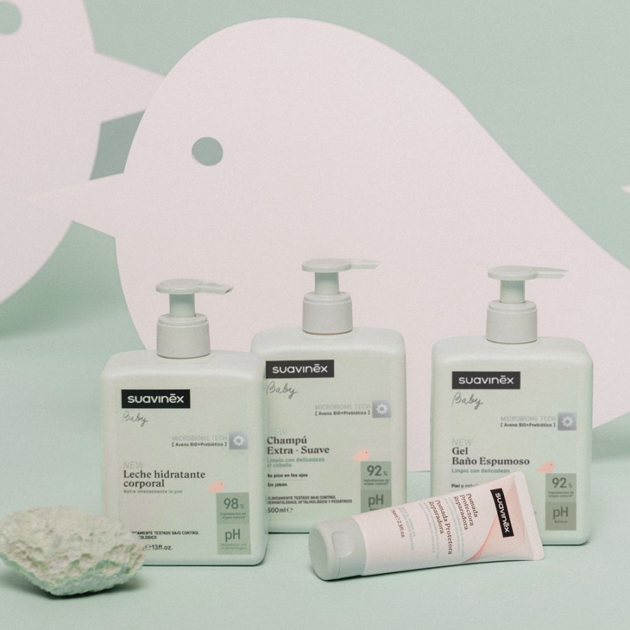 Nová řada svým složením inovované dětské pečující kosmetiky Suavinex přišla právě na pulty španělských lékáren. S jedinečným složením inspirovaným kožním mikrobiomem. Odbornost značky v péči o dětskou pokožku je zárukou úspěchu těchto čtyř produktů: Pěnový koupelový gel 300m, EXTRA jemný - šampon 300ml, Hydratační tělové mléko 300 ml a JEMNÝ koupelový krémový gel 300ml.