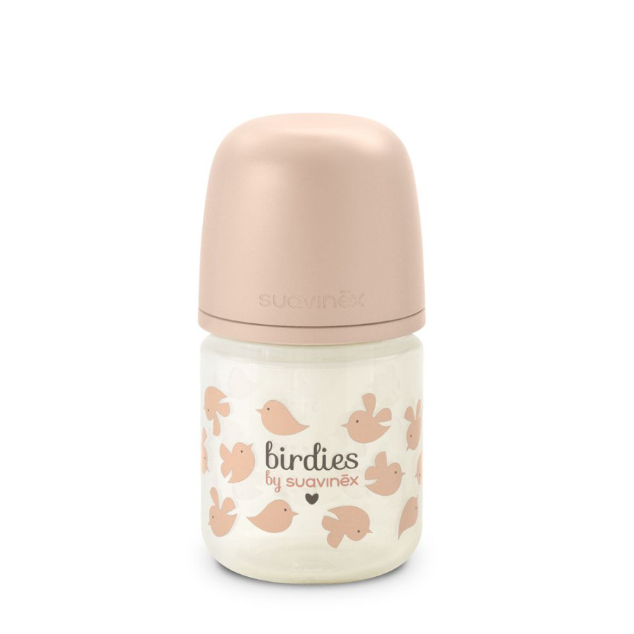Sklenená dojčenská fľaša Suavinex BIRDIES s objemom 120 ml je ideálna pre novorodencov od narodenia. Vybavená je fyziologickým cumlíkom SX PRO zo silikónu, ktorý napodobňuje tvar a pružnosť materskej bradavky. Týmto spôsobom pomáha dieťatku zachovať prirodzený rytmus sania, čo uľahčuje kombinovanie dojčenia a kŕmenia z fľaše. Kolekcia -BIRDIES- prináša hravý dizajn, vyrobený s láskou a dôrazom na detail.