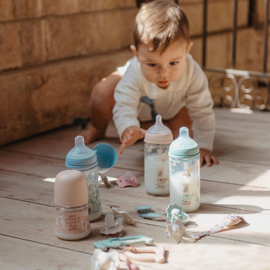 Sklenené fľaše z kolekcie Wonderland so savičkou SX Pro so stredným prietokom sú ideálnou voľbou pre každodenné kŕmenie bábätka.
