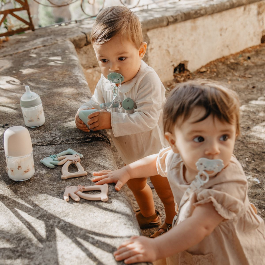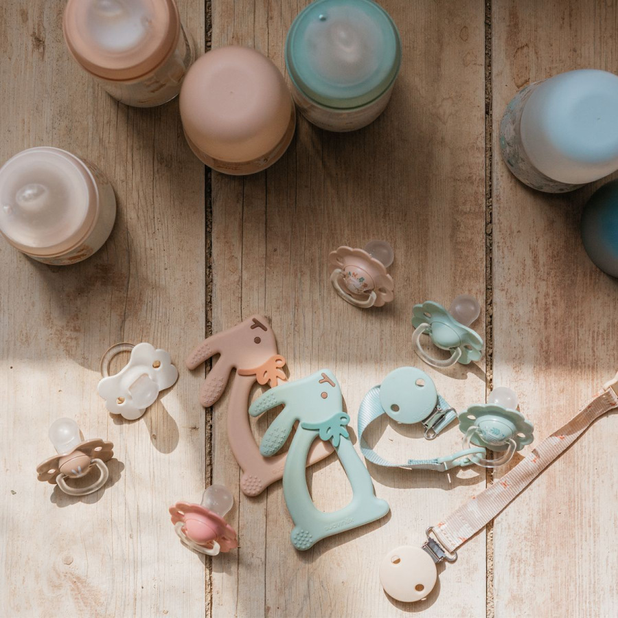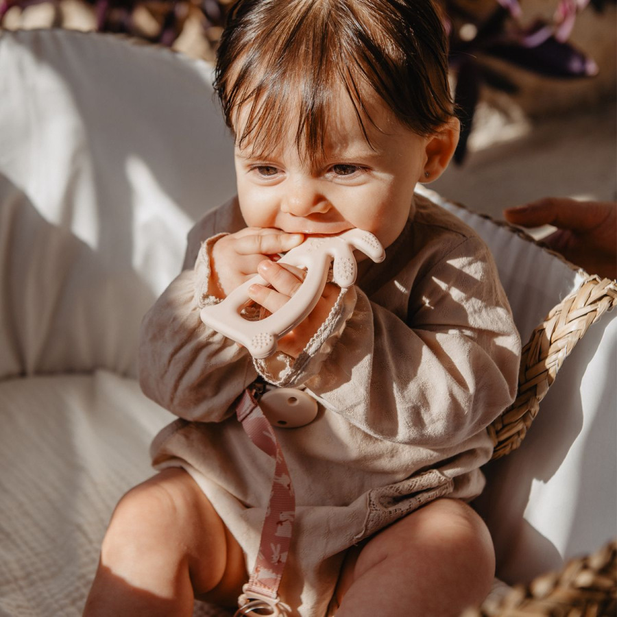 Mäkký a flexibilný silikón je šetrný k citlivým ďasnám, zatiaľ čo jemné výstupky pomáhajú uľaviť pri prerezávaní zúbkov a zároveň podporujú rozvoj jemnej motoriky.
