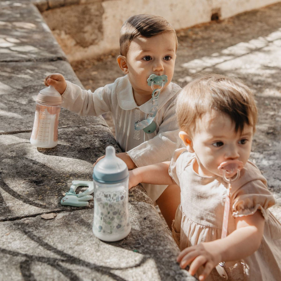 Mäkký a flexibilný silikón je šetrný k citlivým ďasnám, zatiaľ čo jemné výstupky pomáhajú uľaviť pri prerezávaní zúbkov a zároveň podporujú rozvoj jemnej motoriky.
