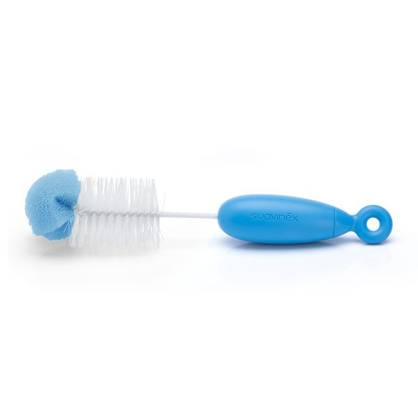 SUAVINEX | Kartáček na čištění lahví DUO - MODRÝ DUO kefa obsahuje veľkú flexibilnú kefu s ergonomickým držadlom pre lepší úchop určenú na čistenie fliaš a vo vnútri držadlá schovanú malú kefku, ktorú vyčistíte všetky potrebné miesta nielen fľaštičiek, ale aj cumlíkov a náhradných cumlíkov.