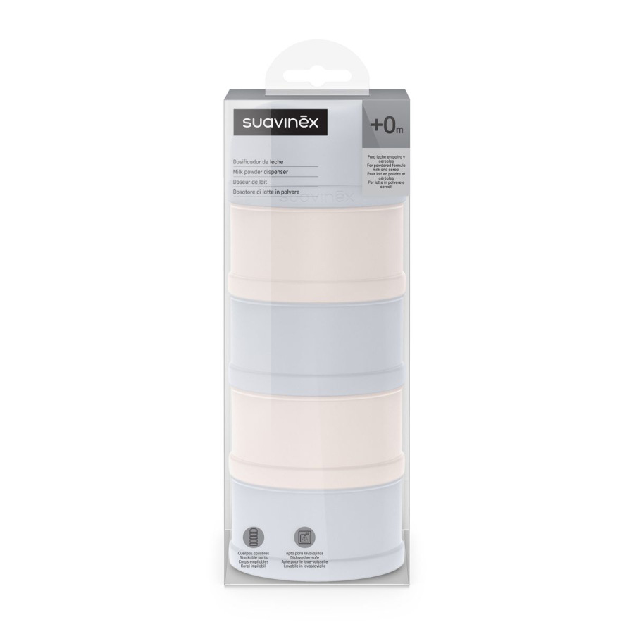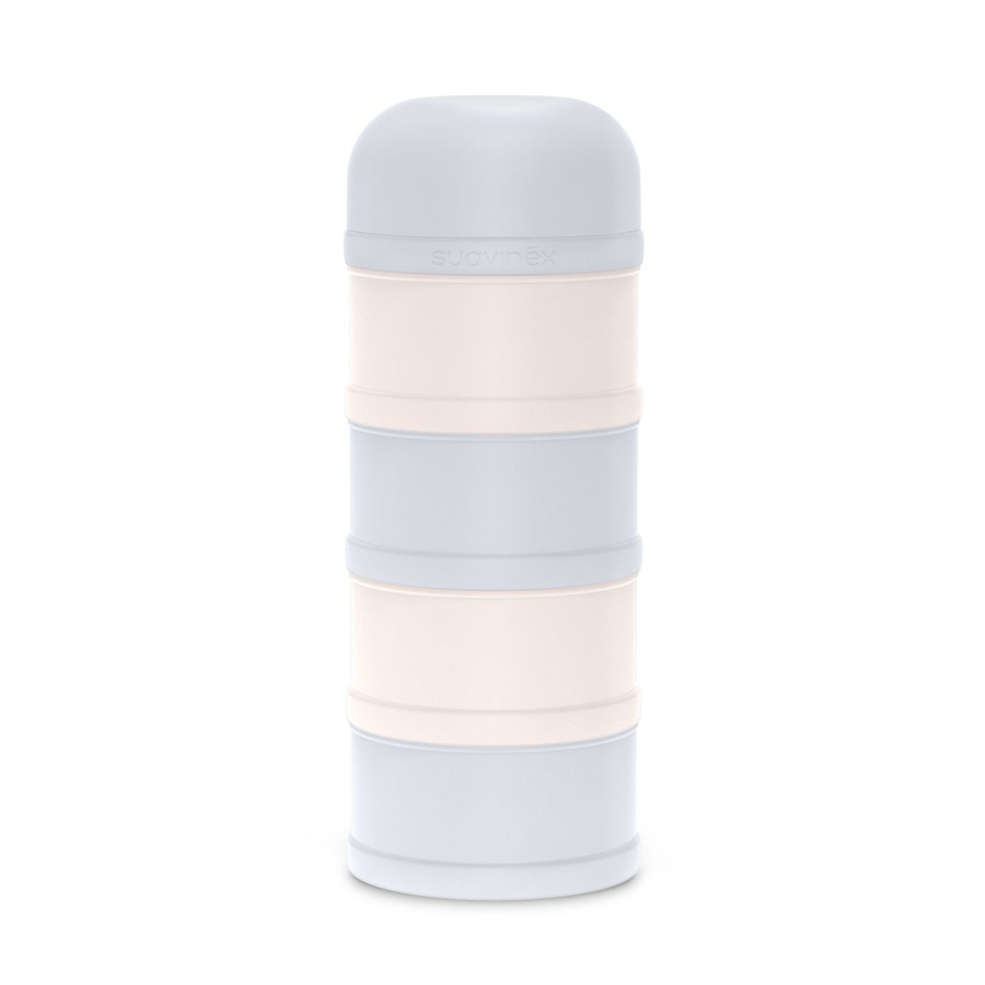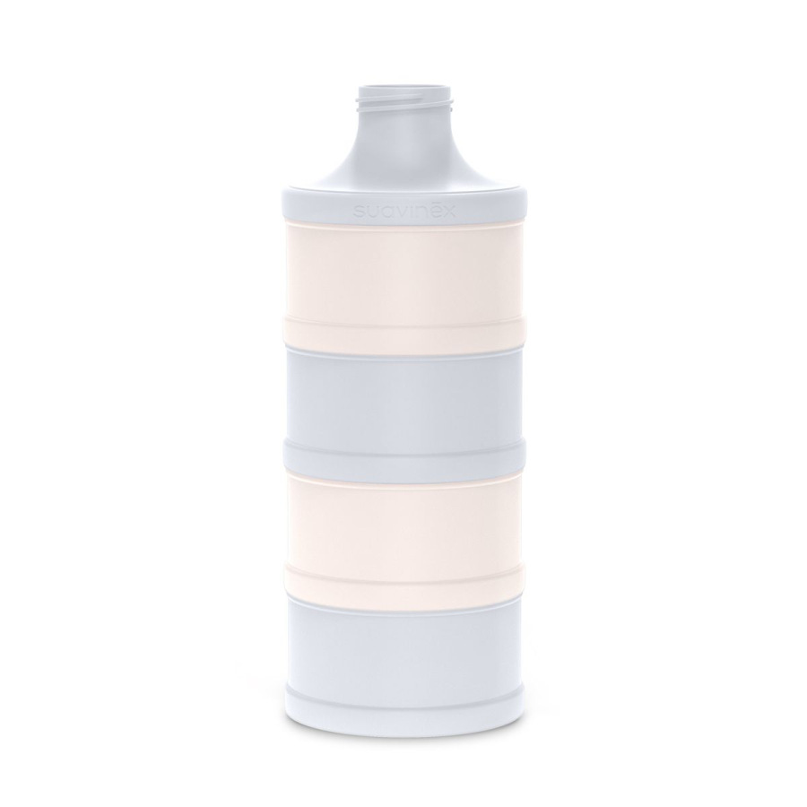 Dávkovač sušeného mlieka značky Suavinex so skrutkovacím uzáverom a stohovateľnými priehradkami. Obsahuje 4 samostatné časti.