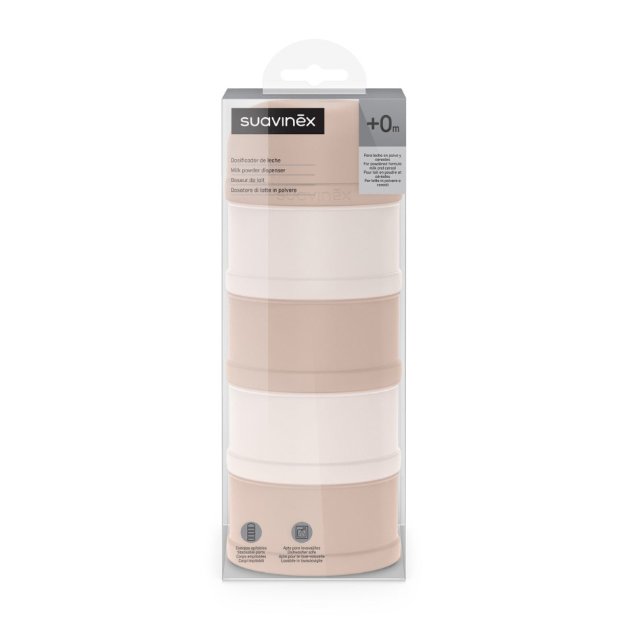 Dávkovač sušeného mlieka značky Suavinex so skrutkovacím uzáverom a stohovateľnými priehradkami. Obsahuje 4 samostatné časti.