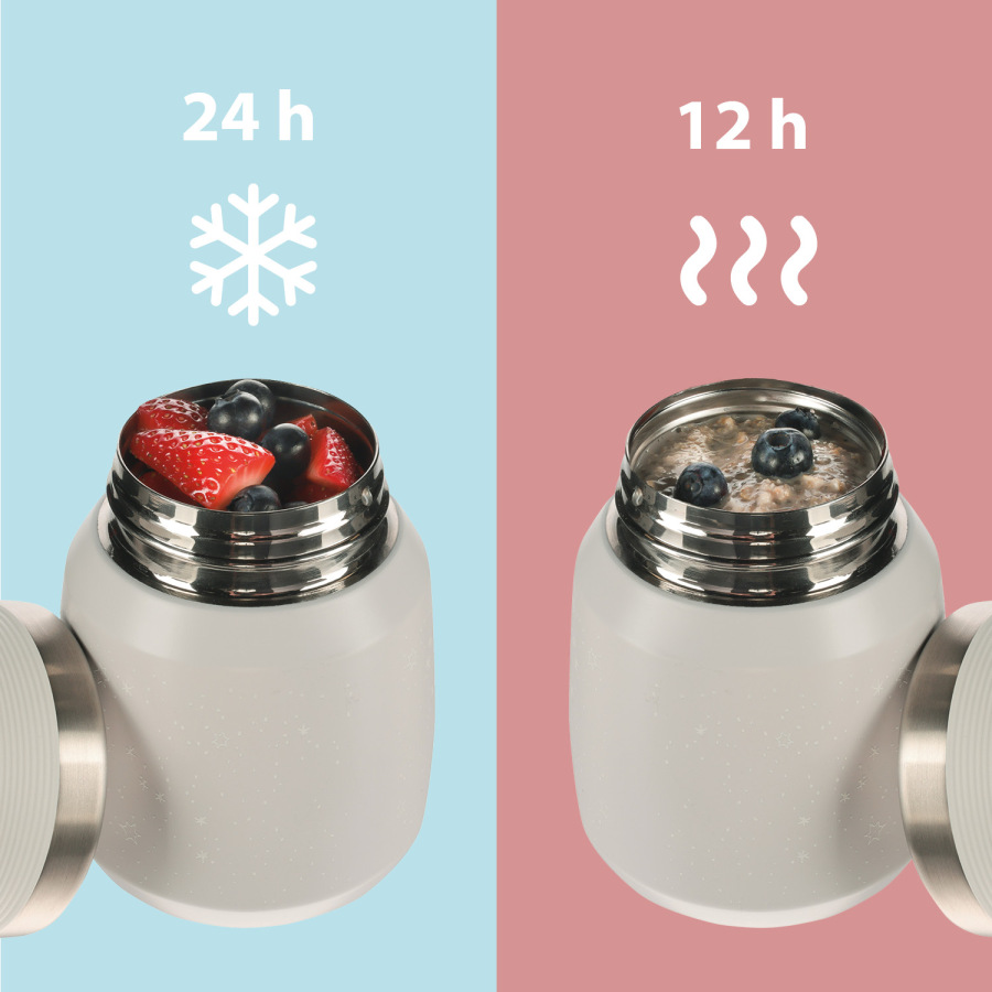 Vysokokvalitná termoska na jedlo a občerstvenie s objemom 300 ml udrží teplé jedlo až 12 hodín a studené jedlo až 24 hodín. Je vyrobená z kvalitnej nehrdzavejúcej ocele, ktorá je odolná proti korózii. Tesne priliehajúce viečko zaisťuje, že termoska nevyteká. Vďaka vákuovej izolácii sa termoska pri naplnení horúcim obsahom zvonku nezahrieva.