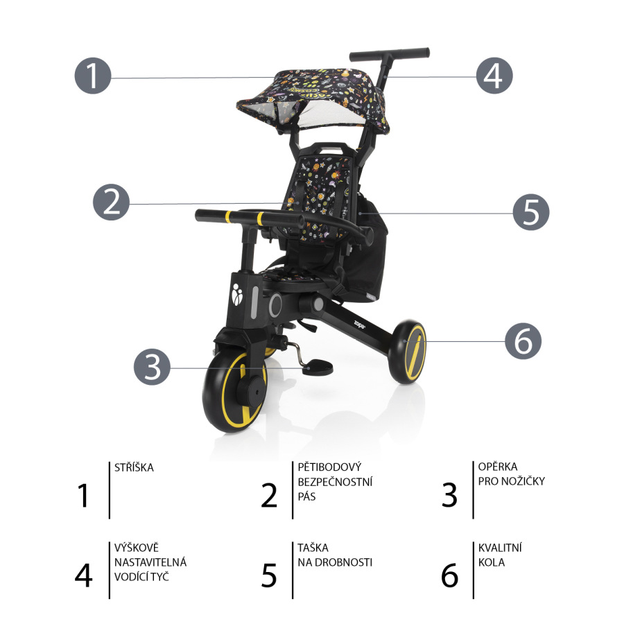 • Odpojiteľné pedále, chrbtová opierka, vodiaca tyč,