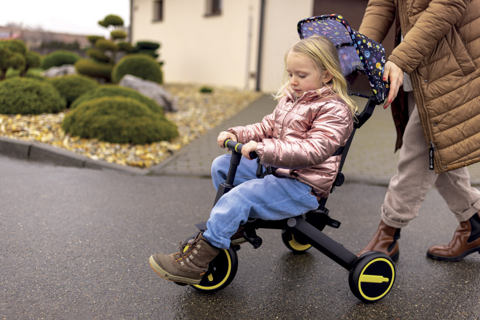 využiť ako pedále, kedy dieťa riadi trojkolku samo, alebo pre menšie deti ako