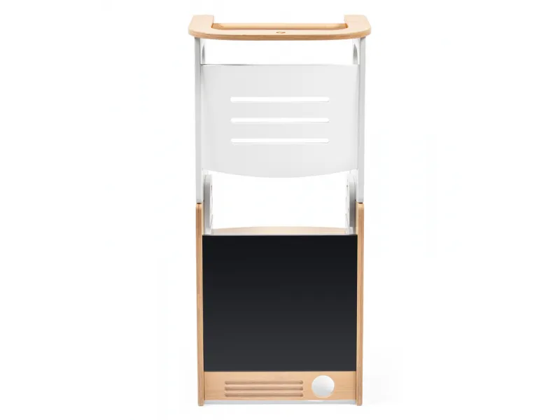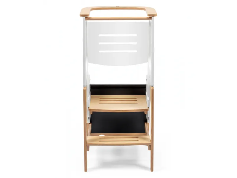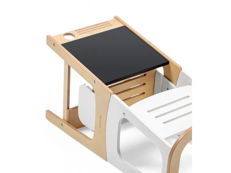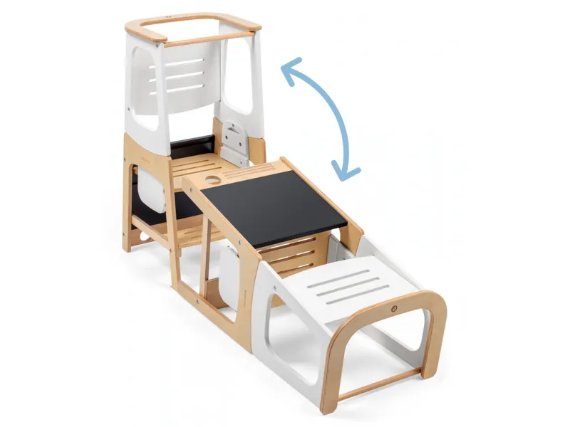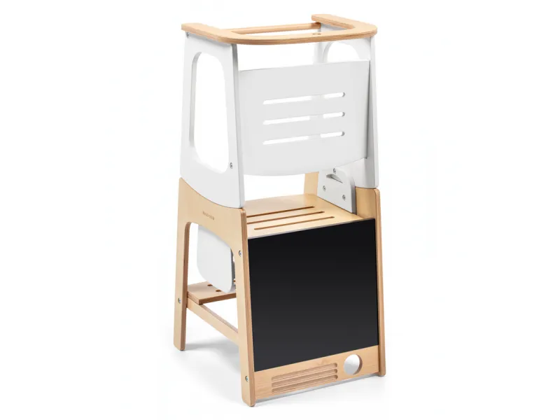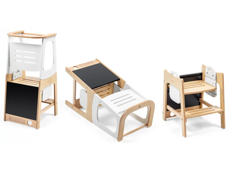 Prevedenie 3v1 ponúka použitie aj ako stôl so stoličkou. Úprava učiacej veže na stôl so stoličkou je veľmi jednoduchá a rýchla. V staršom veku dieťaťa môžete hornú časť odmontovať a ďalej používať spodnú časť ako stoličku, ktorú dieťa využije v kuchyni aj napr. v kúpeľni pri čistení zúbkov.