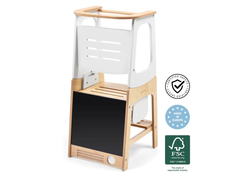 Učiaca veža Toucan 3v1 inšpirovaná princípmi Montessori pomáha dieťaťu získavať väčšiu nezávislosť a samostatnosť. Umožní mu pomáhať rodičom v kuchyni aj rozvíjať svoju kreativitu pri výtvarných aktivitách. Nastaviteľná výška aj zadná zábrana zaisťujú, že dieťa vždy bezpečne a pohodlne dosiahne na pracovnú dosku. Integrovaná tabuľa poskytuje priestor na kreslenie.