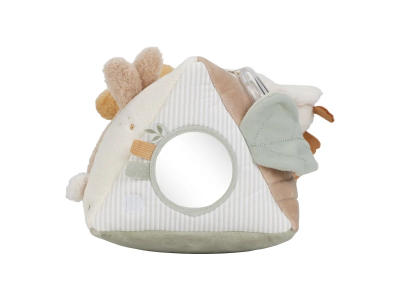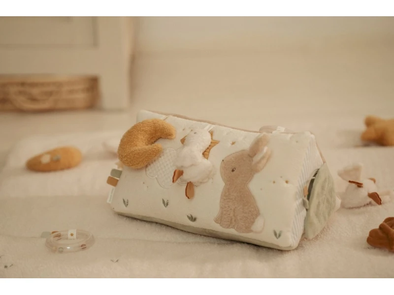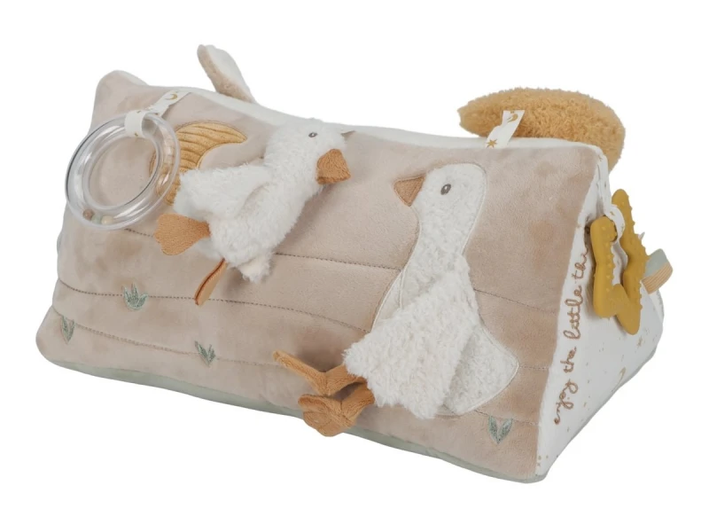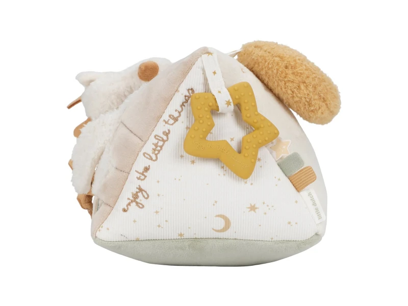 Mäkký trojhranný vankúšik s aktivitami je navrhnutý pre bábätká od narodenia, aby ich hravou formou viedol k prvým dotykom, uchopovaniu a skúmaniu sveta okolo seba. Kombinácia rôznych textúr, jemných zvukov a roztomilých detailov podporuje prirodzený zmyslový vývoj už v ranom veku. Vďaka ľahkému tvaru sa dobre drží v malých rúčkach a je ideálnym doplnkom na hru doma aj na hracej deke. Jemná farebnosť kolekcie Newborn Naturals krásne zapadne do každého interiéru a odráža citlivý dizajn značky Little Dutch.