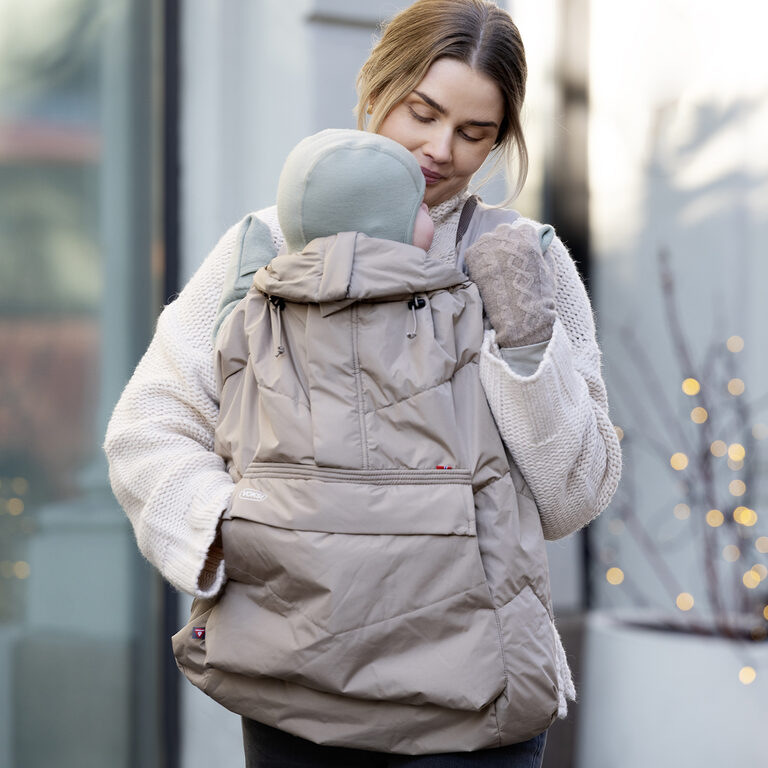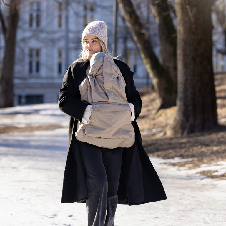 Poťah sa jednoducho pripája na akýkoľvek nosič pomocou patentných gombíkov. Zips v hornej časti umožňuje vetranie alebo rýchly prístup k dieťaťu. Kapucňu možno nastaviť tak, aby tesne priliehala k hlave dieťaťa, a vnútorné elastické šnúrky v oblasti nôh vám umožnia nastaviť ho podľa dĺžky vášho dieťaťa. Vrecká na ruky vám poskytujú priamy kontakt s dieťaťom alebo slúžia aj ako ohrev rúk. Keď sa kryt nepoužíva, dá sa zložiť do skladacieho vrecka na zips. Počas používania ponúka to isté vrecko pohodlné uloženie drobných osobných vecí. Kryt je určený na nosenie vnútri aj vonku a je perfektným praktickým pomocníkom aj v kočíku alebo pri dojčení vonku.