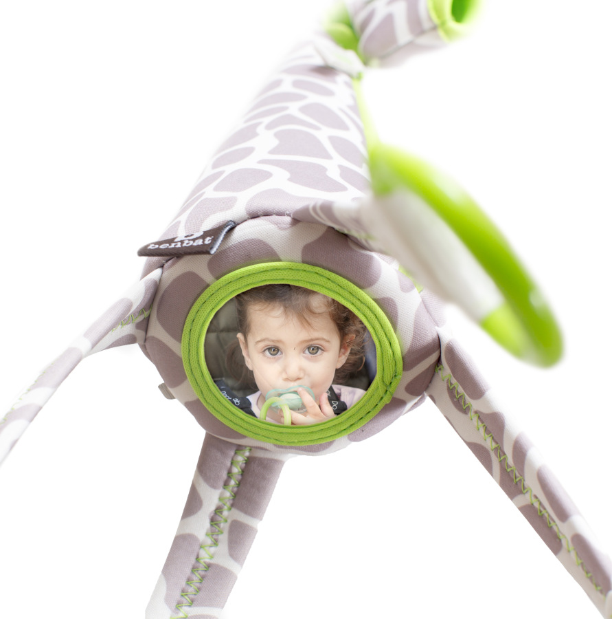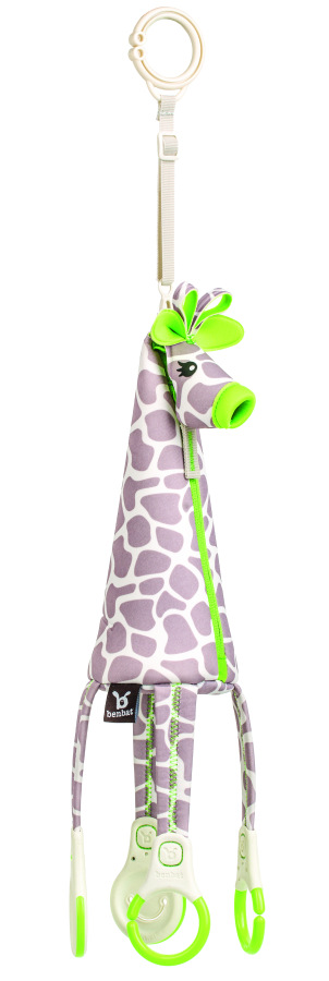 Hravá žirafa poslouží nejen jako hračka, ale také jako praktický organizér. Díky 4 bezpečným háčkům lze na žirafu připevnit například oblíbenou hračku, muchláčka nebo jiné věci, které dítě potřebuje mít vždy po ruce. Praktická kapsa v bříšku žirafy poslouží k uschování dudlíku nebo malé svačinky. Zrcátko zabaví děti na dlouhé minuty.