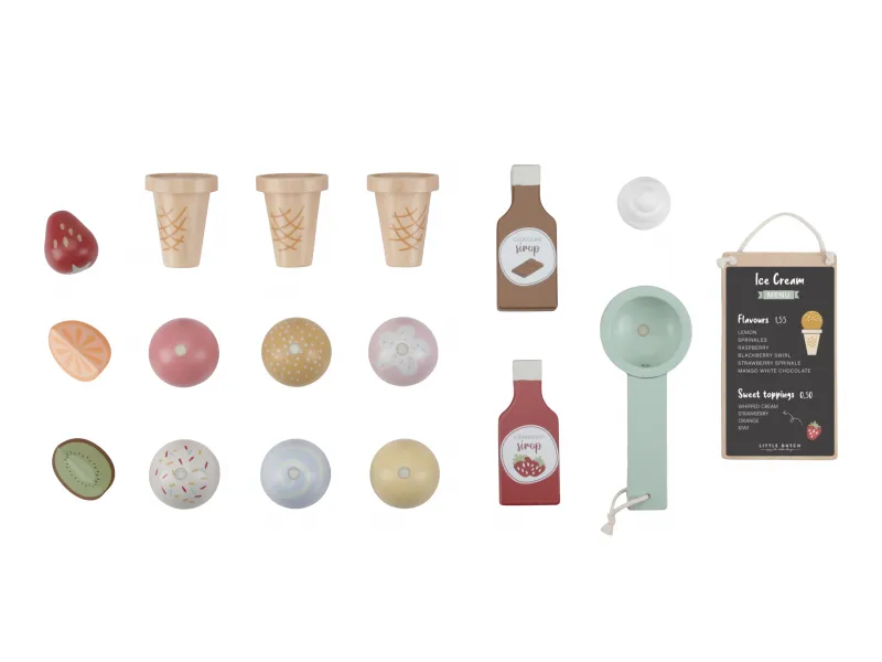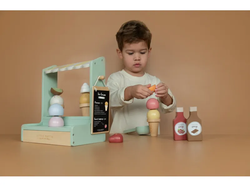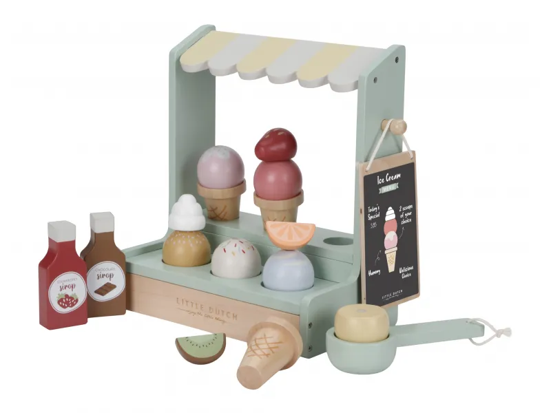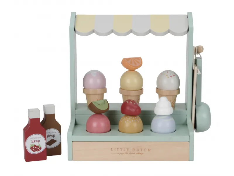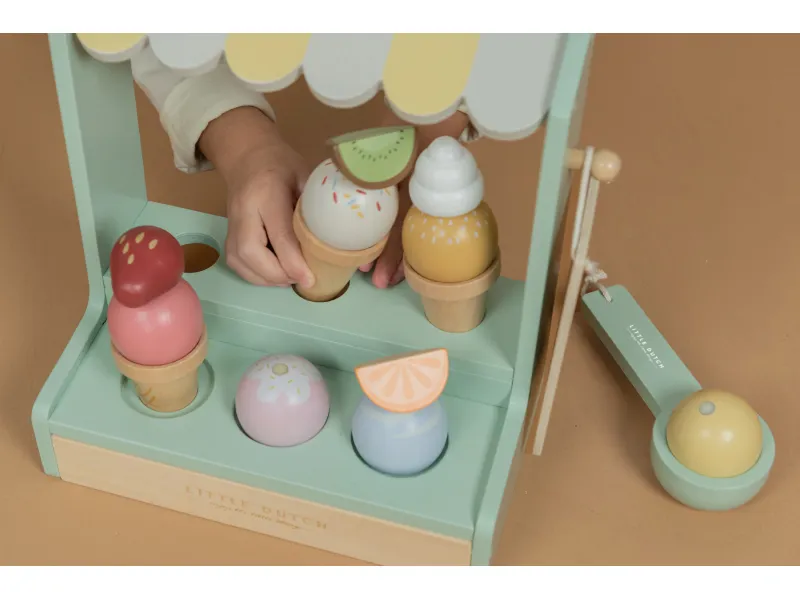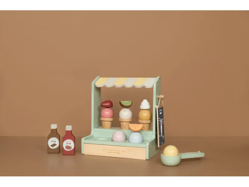 Drevený zmrzlinový stánok ponúka deťom priestor na hravé napodobňovanie sveta dospelých a rozvíjanie fantázie prostredníctvom hry na obchod. Vďaka rôznym príchutiam zmrzliny, kornútom a doplnkom si deti môžu vytvárať vlastné kombinácie a obsluhovať zákazníkov – kamarátov, bábiky či rodinu. Nadčasový dizajn s rozkošnou markízou a kvalitné spracovanie značky Little Dutch zaručujú, že hračka bude obľúbená dlhý čas.