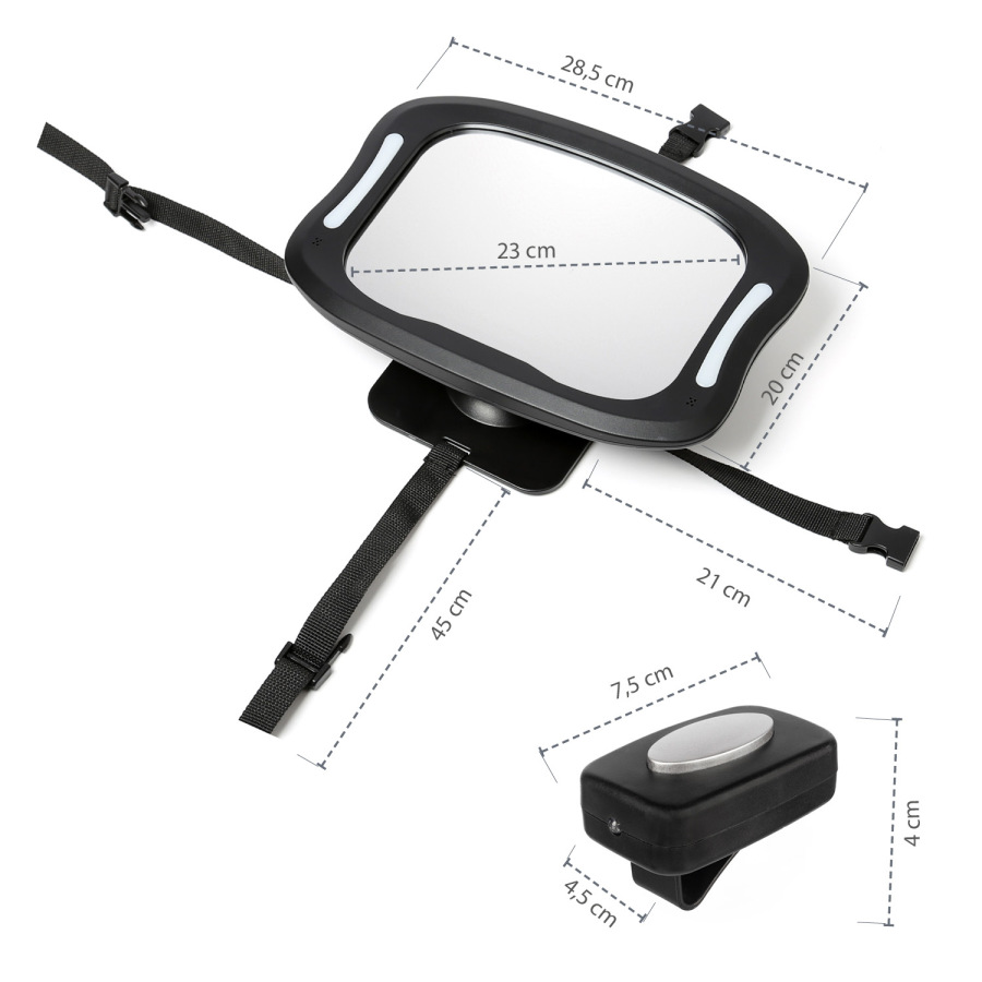 Sledujte svoje dieťa počas jazdy, a to aj v tme. Praktické zrkadlo s osvetlením LED vám umožní vidieť vaše dieťa aj pri slabom osvetlení. Zrkadlo je odolné proti rozbitiu a možno ho ľahko nainštalovať na opierky hlavy sedadla. Má dlhú životnosť batérií a možno ho ovládať diaľkovým ovládaním (zrkadlo 3× AA, diaľkové ovládanie - 2× AAA. Batérie nie sú súčasťou balenia.